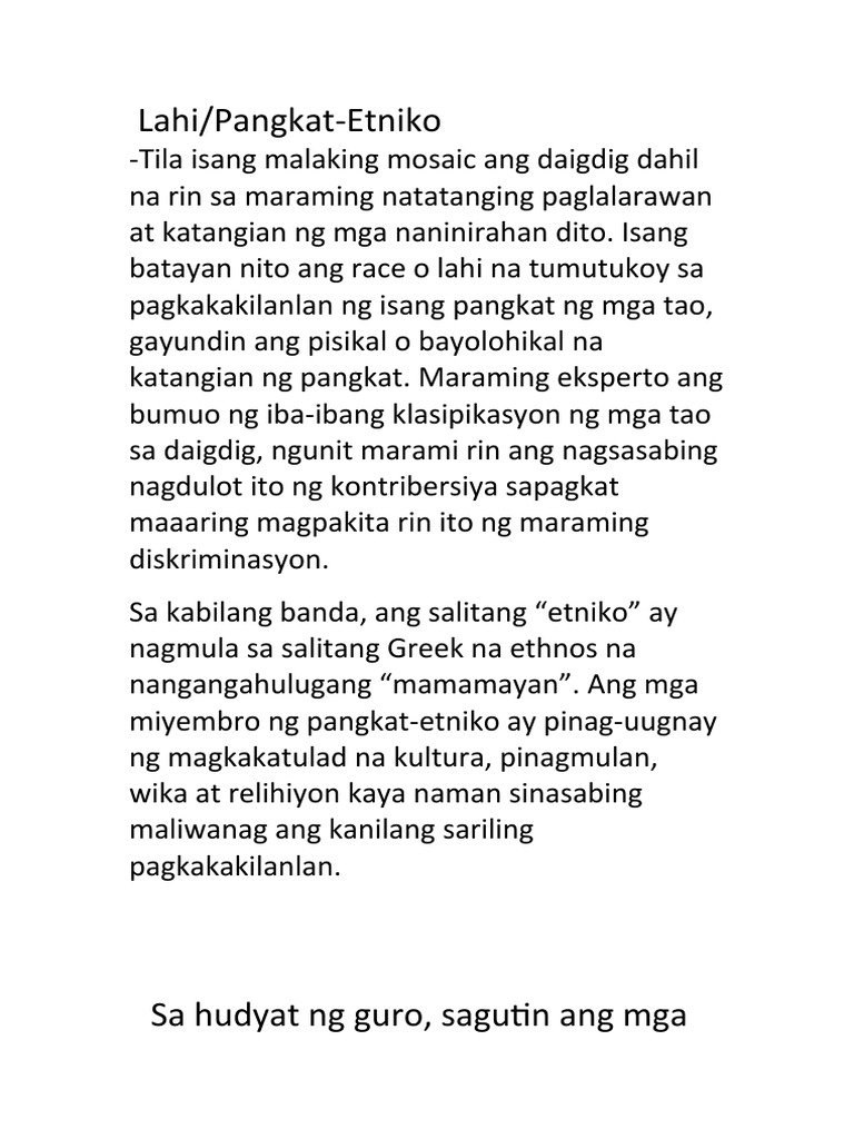 Pangkat ng taong may iisang kultura at pinagmulan Gabay na Tayahin 2 Suriin ang mga sumusunod na larawan saang lahi kabilang ang mga ito. 456 2034 kalipunan ng mga paniniwala at rituwal ng isang pangkat ng mga taong from EDUCATION 101 at University of the City of Pasig Pamantasan ng Lungsod ng Pasig. Salitang Greek ng mamamayan 8.