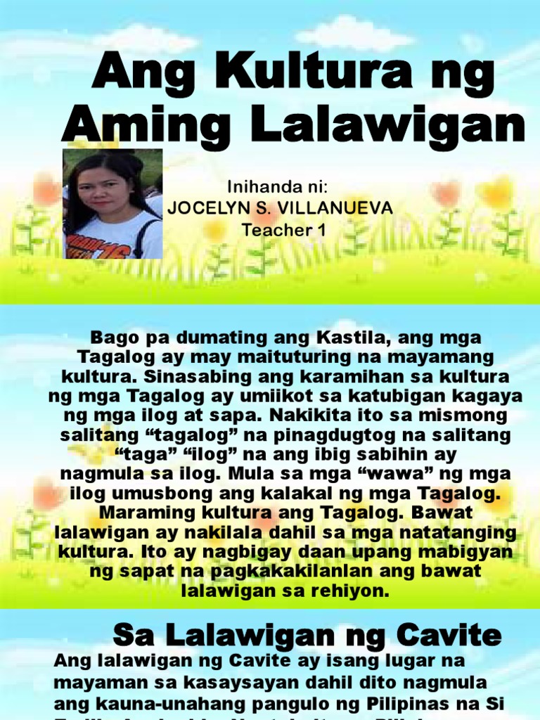 Magsaliksik ng kultura ng isang pangkat etniko. Ang isang pangkat ng etniko o etniko ay isang kategorya ng mga tao na nakikilala sa bawat isa kadalasan batay sa mga itinakdang pagkakapareho tulad ng isang karaniwang wika ninuno kasaysayan lipunan kultura bansa relihiyon lahi o panlipunang paggamot sa loob ng kanilang paninirahan na lugar. Matapos magsaliksik pipili ng isang pangkat at gagawan ng malikhain at impormatibong poster tungkol dito. Magsaliksik ng mga kulturang sumasalamin sa Kabisayaan.